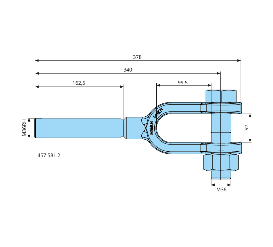 Chape filetéeM36x378mm, filet à droite, galvanisé, forgé, avec boulon & écrou