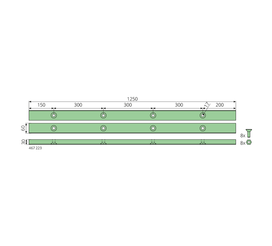 60x30x1250mm, 42CrMo4, à 2 éléments (gauche/droite), avec visserie & écrous, type PAAL