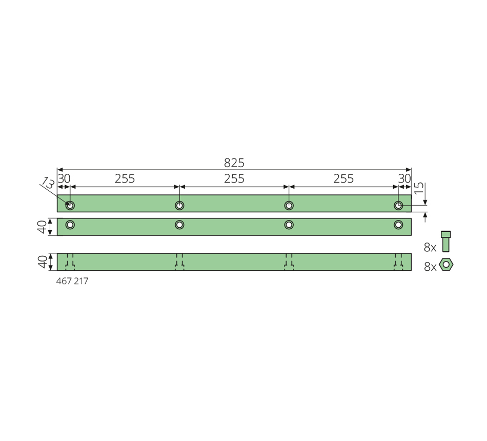 40x40x825mm, 42CrMo4, 2 parts, with screws & nuts, type PAAL