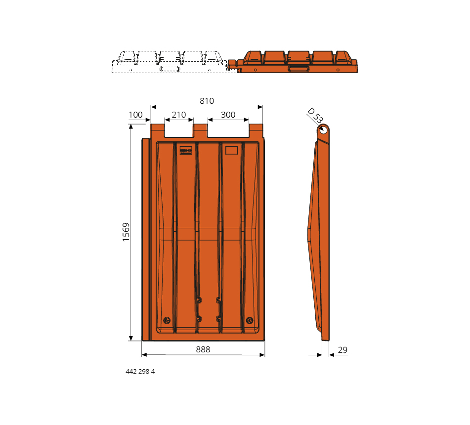 888x1569mm, right, plastic, divided/overlapping, orange (simliar to RAL 2010)
