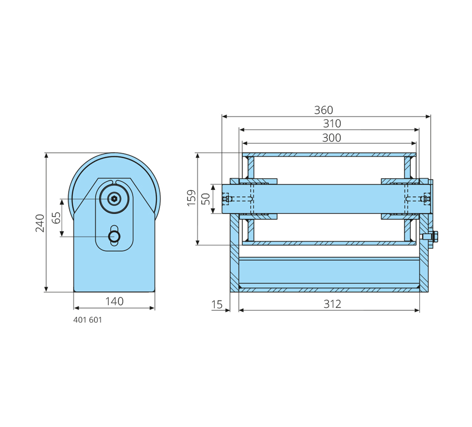 Rouleau acier avec bâti50-159-300/310mm, H=240mm, graissage de l'axe, douille laiton