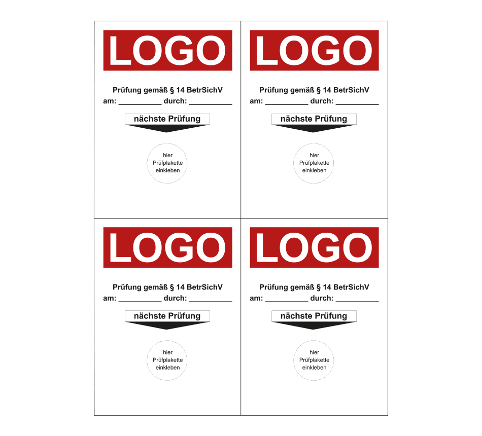 PVC base sticker Prüfung gemäß § 14 BetrSichV mit Logo110x148mm, 4 stickers/sheet